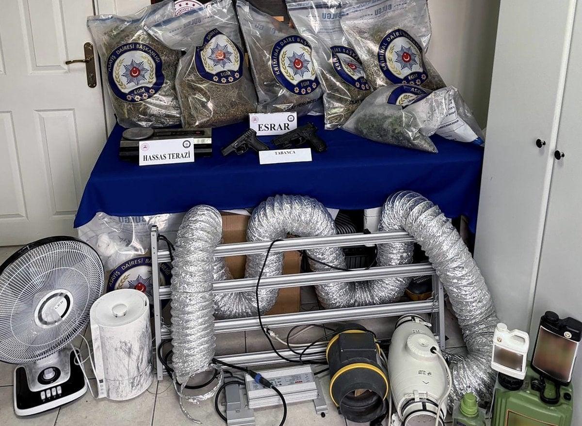 Villada ekiplerin aramalarında, 2 kilo 774 gram kurutulmuş esrar, 40 kök Hint keneviri, ruhsatsız tabanca ve 50 mermi ele geçirilirken, uyuşturucu madde üretiminde kullanılan çeşitli malzemelere de el konuldu.